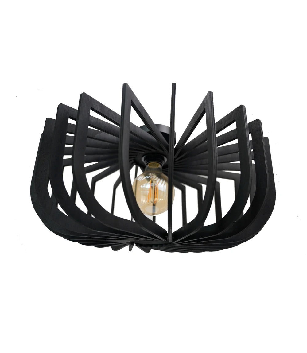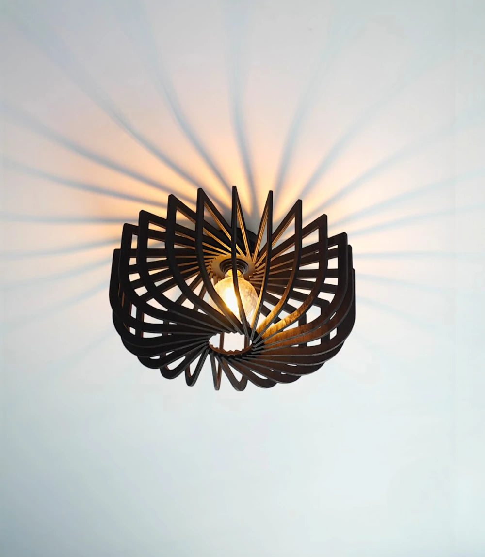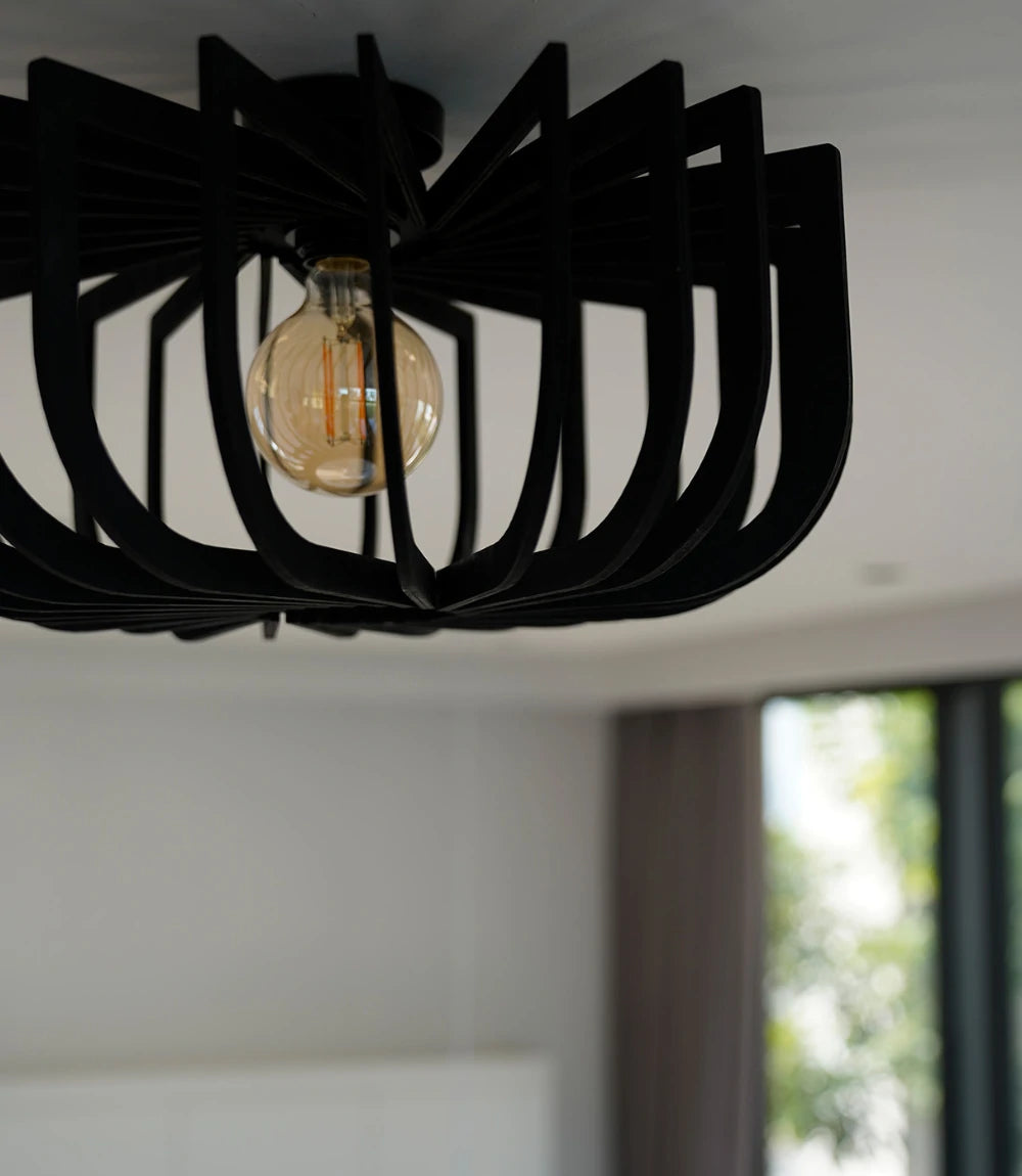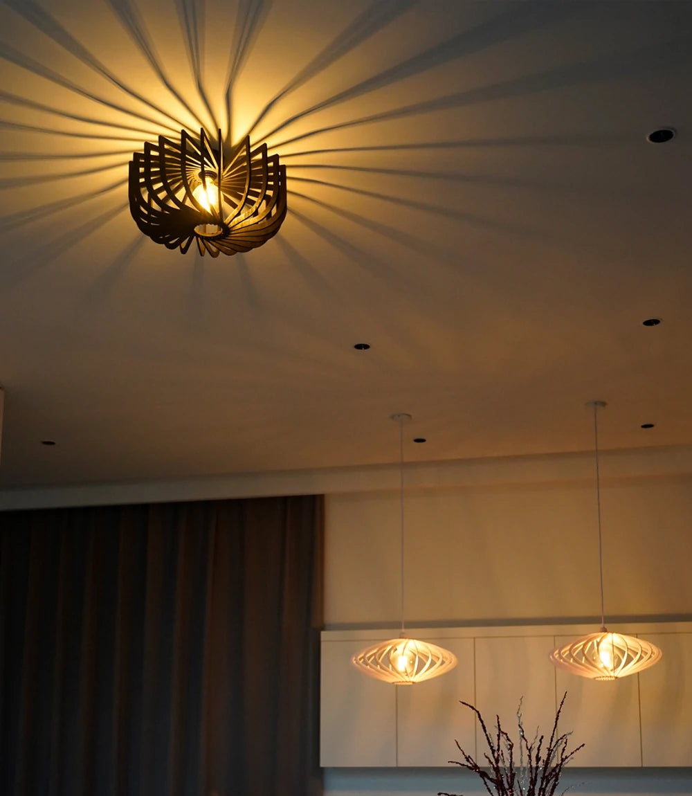 Crafted from natural wood and finished in matte black, Micha redefines modern flush mount lighting. Its semi-flush structure casts geometric shadows that change with every viewing angle—bringing subtle motion and depth to compact spaces.